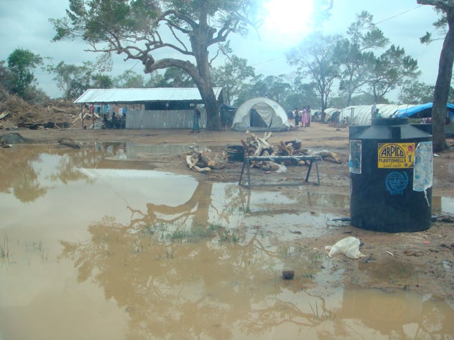 Heavy and sudden showers since Friday have caused havoc at the main complex of refugee camps at Manik Farm, home to some 230,000 people.